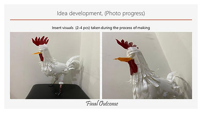 As a whole, plastic bottle is harder to bend into my desire shape, so my solution is to break it down into parts and stick them using hot glue gun. I also found that there are different textures and curve angle on different type of plastic bottles, which I combined them to form different body parts of a rooster. I like to experiment on the arrangement to see the different end results. From this project, I explored some methods to cut, join, bend, overlap, twist and paint the plastic bottles, and completed a rooster sculpture.