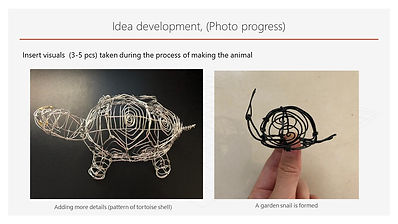 I used different colour to form the garden snail so that the overall sculpture looks more interesting. I also used gold wire to enhance the eyes of tortoise and I am quite happy with the final outcome. Overall speaking, I enjoyed this assignment because it is fun to explore a brand new material which I never use before.